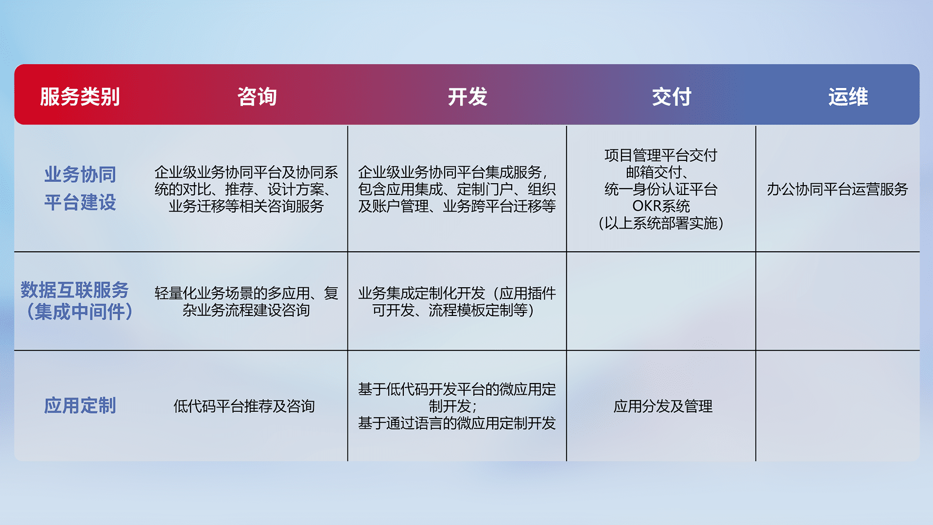 针对钉钉、、、企微、、、、IDaas等平台级产品提供产品的规划、、方案、、、、交付、、定制化开发等服务,,,,实现如统一协同办公、、智能客户服务、、、、混合会议管理、、、智能数据查询、、等业务场景,,实现数字化转型。。。
